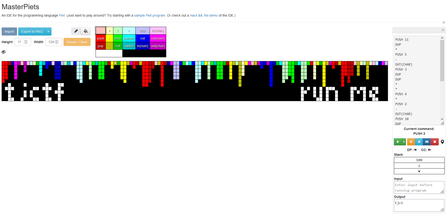 With the following webpage I obtained the flag: https://gabriellesc.github.io/piet/