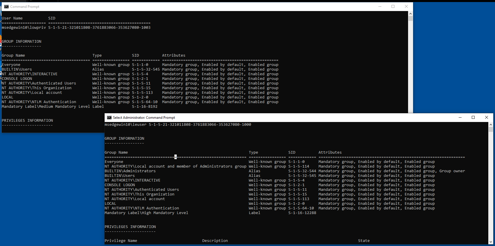 Thus, the SID Replacement can be consider a Group SID replacemente or Integrity SID replacement. Remember, for this you need to create a low priv user, because ieuser is in the Admin Group, so he doesnt need to enter the password or any auth to execute as admin,