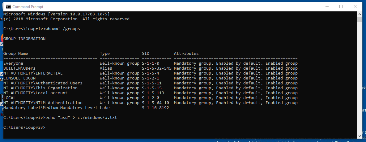 Despite all, binaries like: whoami wont be recognized by the shell and if you try to execute it with the full path it will crash the OS. One theory is that it is the relationship between the user and the process token, causing a mismatch that leads to the crash, but surely this is not even close to what is really happening.
